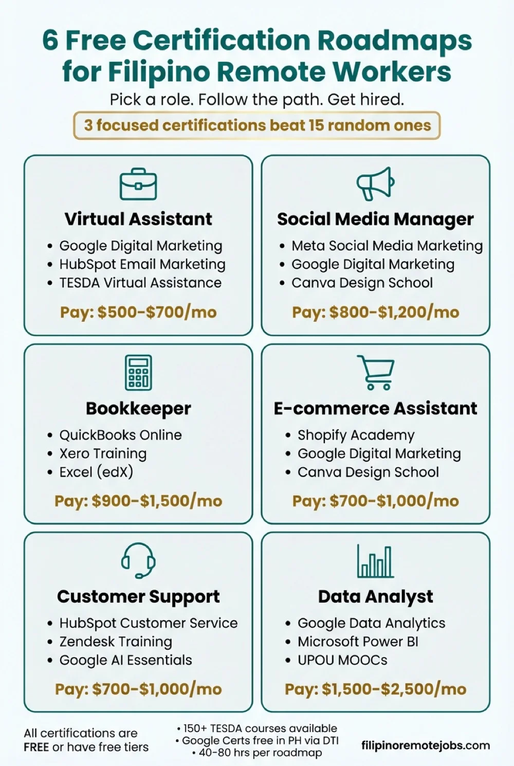 Stop collecting random certificates. These role-specific certification roadmaps show Filipino remote workers exactly which free courses to take for VA, social media, bookkeeping, e-commerce, customer support, and data roles.