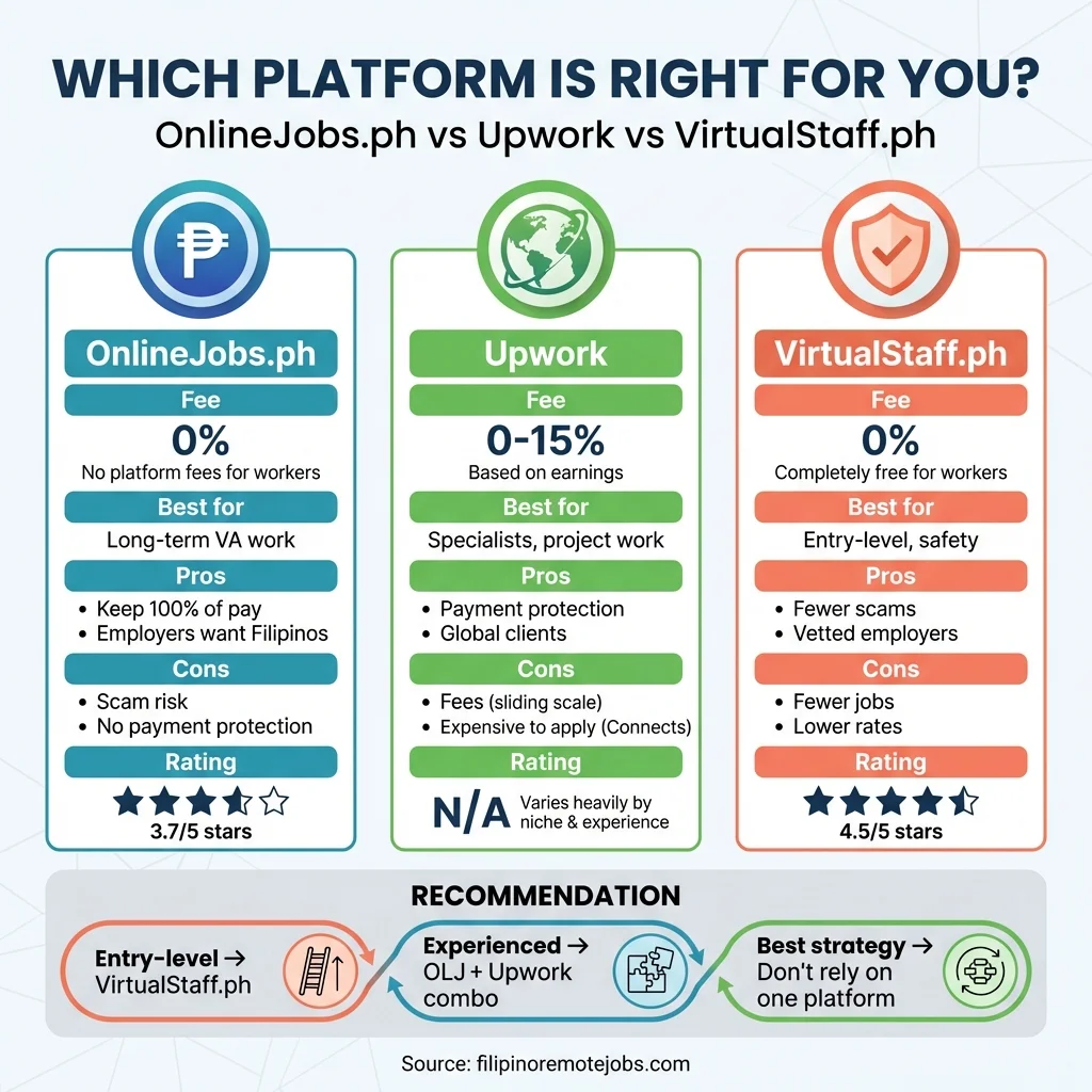 OnlineJobs.ph vs Upwork vs VirtualStaff.ph: Honest Comparison for Filipino Job Seekers (2026)